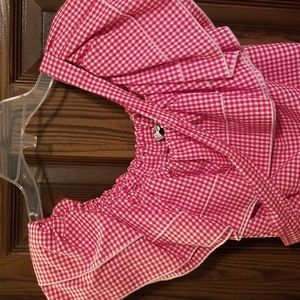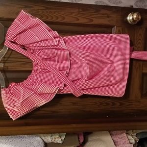 Red and white gingham top with tie at waist can be worn on or off shoulders