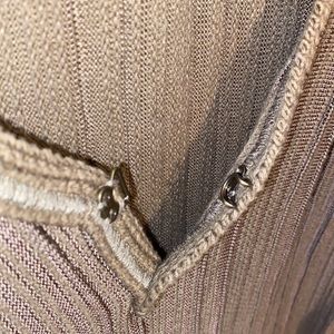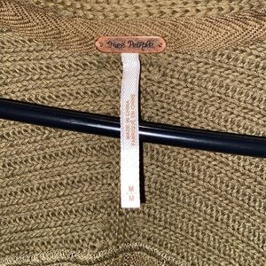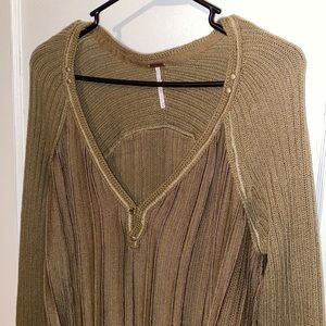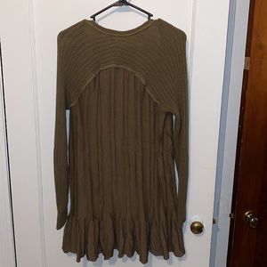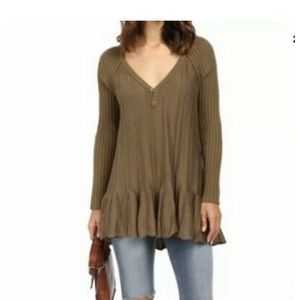 Free People Ribs and Ruffles long sleeve knit sweater. Clasp neckline. Studs on shoulders. Ruffles flowy waistline. Olive green knit. Size medium. Pit to pit approx 19.5 inch flat laying across. Used but in great condition. 5
