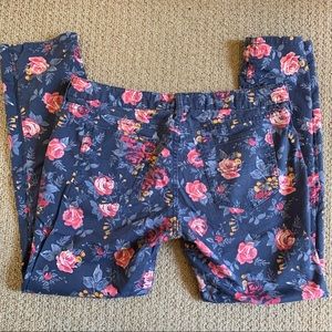 Size 13 cotton & spandex floral ankle pants by Arizona Jean Company bought at JCP. Pink roses & yellow flowers with blue leaves on a slightly darker blue background. Super soft & comfy & great for spring/summer. Functional pockets all around!