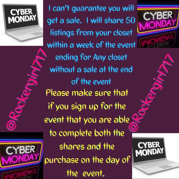 Event is Midnight to Midnight. Please complete shares & purchase within the 24 hr event time frame. DO NOT sign up if you are not able to complete the event. Failure to complete event May lead to your closet not being able to participate in future events.