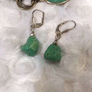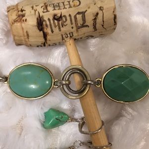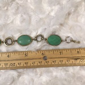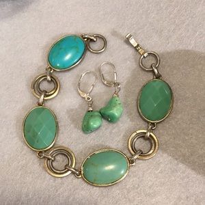 AQUA Green color set bracelet and dangle earrings . Brass setting hand link, bezel w green stones for a bohemian natural look in great condition Beautiful color for layering or added pop of color. Bracelet is stamped Not sure of the name A nice set to wear is very well made and vintage 1990s.