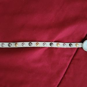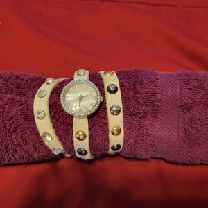 Beautiful leather wrap around watch with grommet and cubic zirconia accents. Snap closure. Needs watch battery.