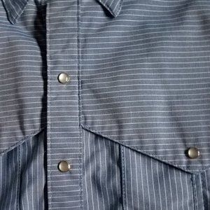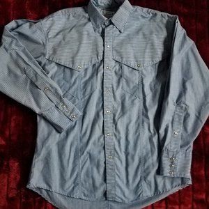 Blue with white pinstripe vintage western shirt. Snap pearl buttons. Great condition. No rips, stains or tears. From a smoke free and pet free home.