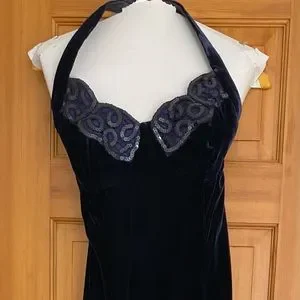Gorgeous vintage velvet full length evening gown. Exclusive Collection Saks Fifth Avenue David Fielden. Navy blue sequins embellished lace. Scalloped V neckline. Flat neck strap. Concealed zip back closure. Fully lined. Made in London. Note- tag says size 10 but was tailored for US size 6. Great condition. Recently dry cleaned.