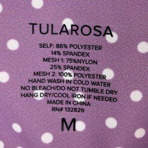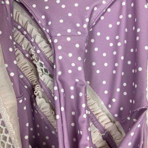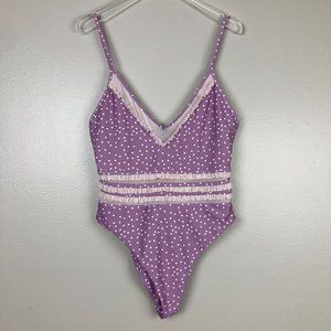 Tularosa "Rosey One Piece" onepiece swimsuit in "Dusty Lavender Dot". Adjustable shoulder straps, mesh panels, mesh ruffle details. Stretchy and soft polyester blend. Women's medium. Originally $148.