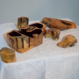 Handcrafted and signed by the artist, this box is approximately 8 1/2 x 4 1/2 x 3 1/4. Storage areas are lined with wine-colored flocking. Meticulously cut and polished while maintaining the natural details of the wood. Used for display only.