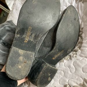 Adorable and comfy riding boots. No zipper they just slide on. Cute washed out grey colour. Soles just need to be cleaned.