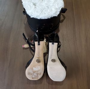 LITERALLY, FU Heels. Patent platform, strappy Stiletto. leather outer soles. Suede straps and hand. Hand is meticulously embellished with a crystal tennis bracelet and manicured nail.