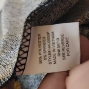 Black, army green and rust are the main colors. Beautiful slightly oversized knit style blouse. Animal print. Buttons accent the side of the blouse in a slant. Buttons meet the center of the hem with a small v at the hemline. The buttons are not functional. Long sleeves. Cowl turtle neck style. Pullover.