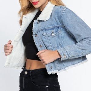 Last New Crop Denim Jean Jacket Frayed Sherpa Inner Fur Long Sleeve Premium