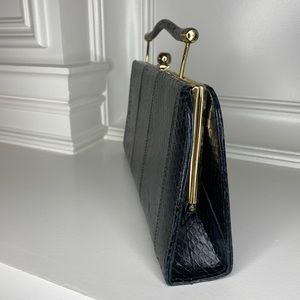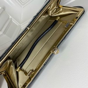 Framed with gold tone clap and hardware with a bar handle on top. The handle can tuck inside to form a clutch bag.
