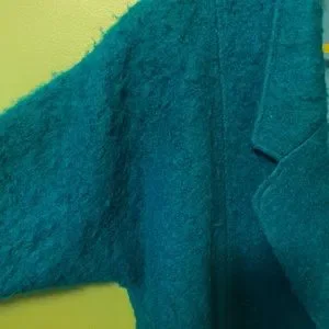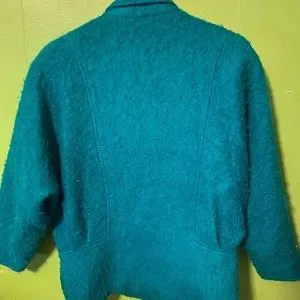 Excellent condition fuzzy wool teal jacket. From the 1980’s, has slight shoulder pad, 3/4 batwing sleeves. Side slit pockets. It’s a beauty.