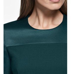 A beautifully tailored dress in a stretch-wool suiting fabric from ITALY stands out in a rich green hue matched to a satiny yoke and sleeve panels.