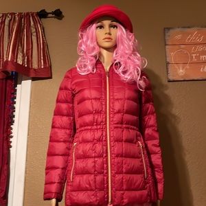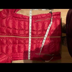This is another of my beautiful jackets barely worn, again I like to use different jackets so is almost new !!!!! Light weight with hood, Adjustable waist. Bright color red. Gold zipper