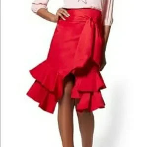 Brand new with tags red ladylike wrap skirt, enhanced by ruffled embellishment and a flattering front self-tie belt. Tiered ruffle hem. Invisible center back zipper. Darts below back waistband. Full silhouette. Sits at waist. This fabric is quality and holds you, yet has a little stretch to it.