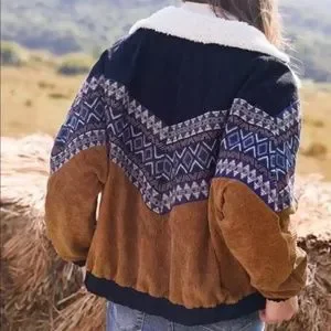 Navy Camel Corduroy shearling line tribal Button Jacket Boho Teddy