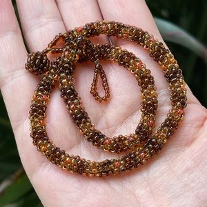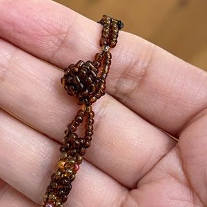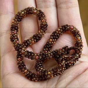 This is a beautiful 1970s style woven / mesh bead choker necklace. The beads are brown with pink red intervals. Measures 15 inches end to end. In excellent vintage condition.