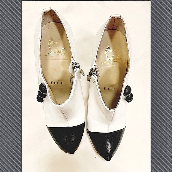 Beautiful Authentic Christian Louboutin Ankle Boots in White and Black Leather with inside silver plated ankle Zipper. Worn very gently on just a few occasions which is noticeable on the barely scratched original trademark red soles.