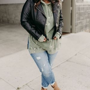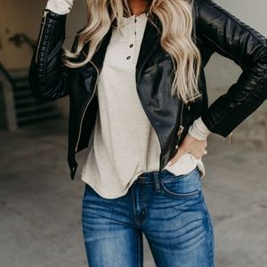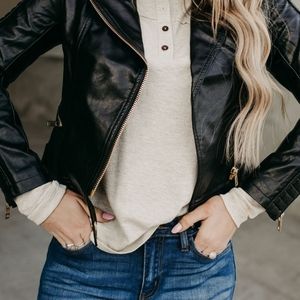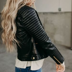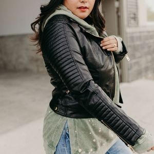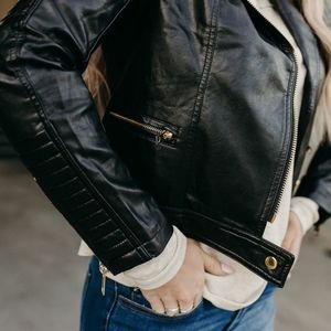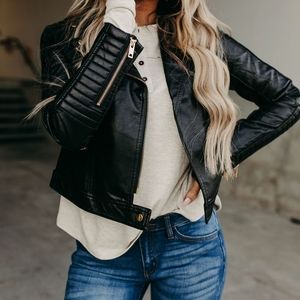 Brand new, Love Tree, Reagan Moto Jacket. Absolutely stunning! Unfortunately it is too small in the bust for me. Cropped style, vegan leather. Perfect for fall/winter looks. Super versatile. No damage or flaws. Measurements are approximate. Length measurements are taken from the top of the shoulder to the bottom hem laying flat. Bust: 41", Waist: 37", Hip: 38", Length: 20.5"