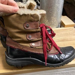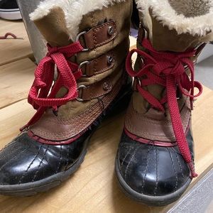 These are super cute - red trim and laces with plaid interior. Some of the stitching is fraying — see pictures but otherwise these are in good shape.
