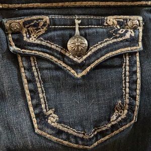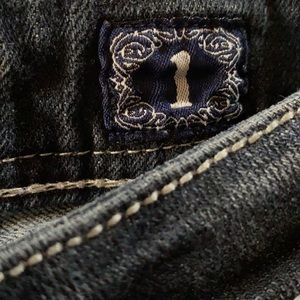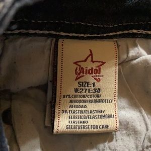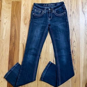 L.A. Idol Jeans, Size 1, 27” x 34”, Dark Wash, lightly Distressed, Excellent Condition, Boot Cut, From a smoke free home