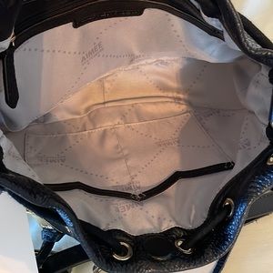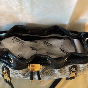 Brand new never used. Aimee Kestenberg Grey Snake in color. Mini Pebble Drawstring Leather. (Sasha). 12x7 in size.one side of purse has snake print but other side is solid black. This classy purse will bring joy to some beautiful amazing woman!