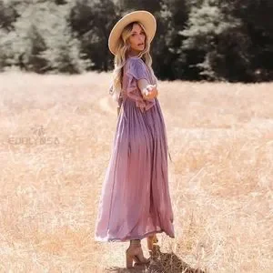 Butterfly Orchid Boho Gauze Button Front Flutter Maxi Dress W/Adjustable Tie