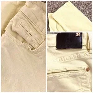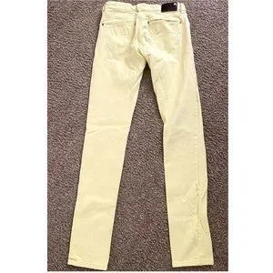 BCBGMAXAZRIA Chartreuse (yellow) Mia pant/ jeans in great used condition. The color is still bright with gold buttons. 5 pockets, zip fly, skinnier leg. 99% cotton & 1% spandex but they do have some stretch. 14.5โ flat waist, size 27/4, 7.5โ rise, 5โ open ankles & 32โ inseam. Super cute & great w/ booties ๐๐