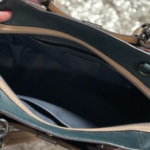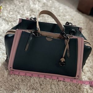 Used once still has plastic on hardware. Color is dark green, mauve boarder and tan zipper and handles. Add to your collection and show this purse your love! ๐ measurements in pictures ๐๐