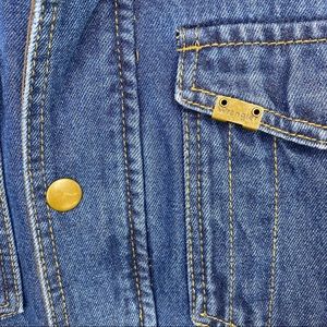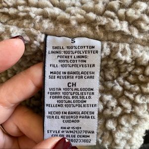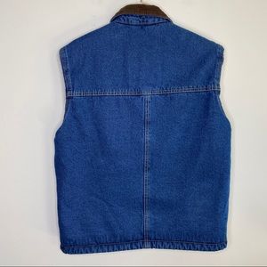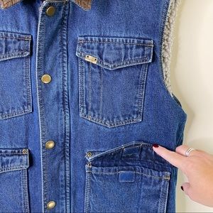 Vintage Sherpa lined corduroy trim blue denim vest by WRANGLER! This is in a western style outerwear. Full zip up with buttons over it! Size Small.