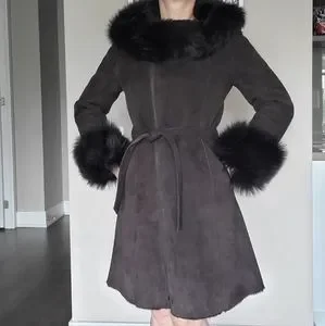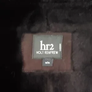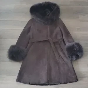 Warm, soft & elegant Holt Renfrew brand, made in Turkey πΉπ·, chocolate brown color, genuine shearling coat. 7/8 length, front zipper closure. A-line shape, waistline belt. 2 side front side pockets. Long, straight sleeves with fur finishing. Rich, and sumptuous in texture. Large fur collar/fur finished hood, with 2 buttons front closure.