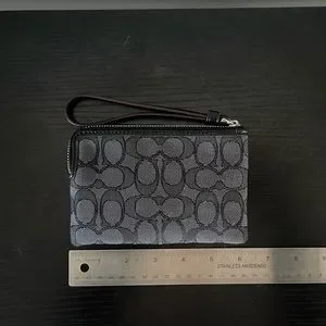 Coach corner zip wristlet black/gray fabric, leather trim