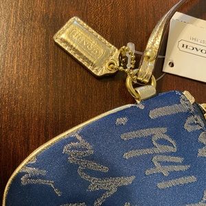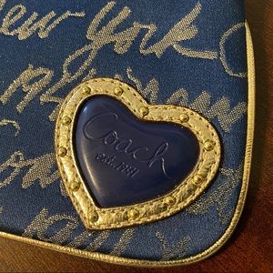 Coach wristlet; dark blue and gold iridescent; Signature Coach lettering; trimmed with gold leather piping; gold wrist strap and tag; zip top closure; blue 3-dimensional heart trimmed in gold studded leather; quality Coach fabric; interior slip pocket; 4.5 x 6.5 inches at widest point. Can also be used as a coin purse or wallet. NWT