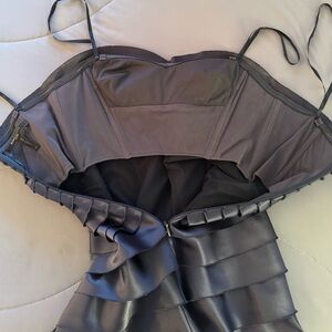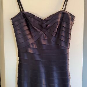 BCBG MAXAZRIA Pleated dress in size OP. Color is dark blue/dark grey depending on the lighting. Feels like Satin and is lined. Good condition.