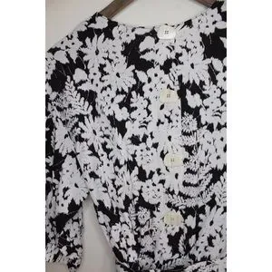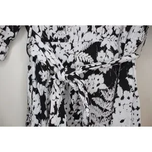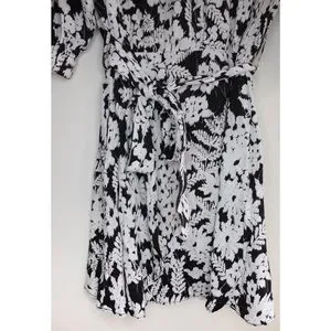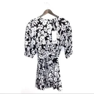 Black and white floral mini dress. Belted waist. Cinched cuffs. 100% Viscose.