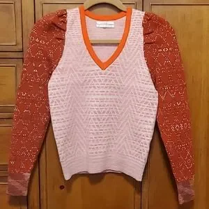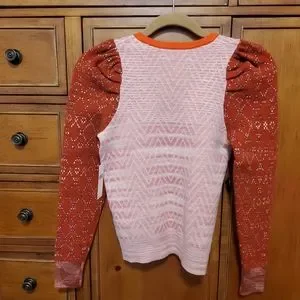 Softest sweater ever. Pinks, frosty white, creamy peach, sienna red, coal gray, and a pop of neon orange. This fits true to size as an XS 0-4. Worn once to a Christmas party and had cleaned.