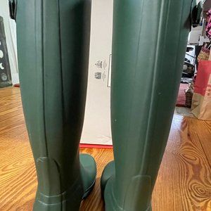 VIRTUALLY UNWORN Hunter Women's classic green rubber boots in box. Euro size 40-41 as shown in pic. Purchased last year for $150, but forgot to try on until it was too late for returning. Wore them once for 20 minute walk on grass. Minor scuffs as shown. (Box has hole in it courtesy of USPS, as shown in pic 1; boots were unharmed). No returns.
