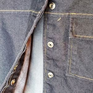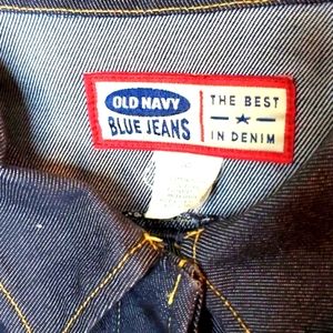 Woman Old Navy long sleeve dark blue denim button down jean jacket with front pocket.