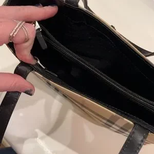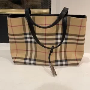 This is a new, never used authentic Burberry House Check Small Tote. It is crafted of classic house check coated canvas. It has black straps with no wear and an open top. The interior has a middle zipper pocket, 2 compartments on each side. On one of those sides there is a small zipper pocket. There are two darker spots on one side. It is not from wear, but came from the interior of the bag. As you can see in the photos, the wrapper coating has never been taken off the Burberry silver metal tag on the outside of the bag.