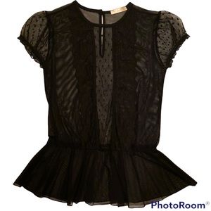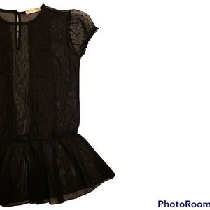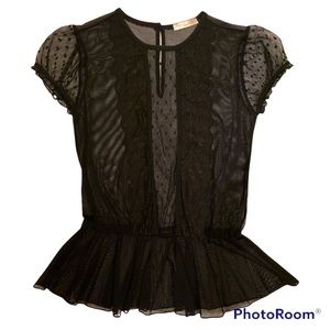 SHEER BLACK WITH LACE FRONT DETAIL CAP SLEEVES PERFECT CINCHED WAIST RARE SEXY BLOUSE