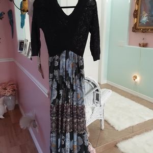 Beautiful Free People sweater silke maxi dress ( top of dress is a cotton sweater material, crocheted type) bottom is a silkie floral blue very pretty & is lined, this dress originally was made in 2 colors, red & blue, the blue is more rare, fyi,