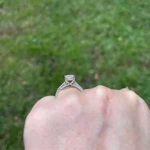 Beautiful 1.5ct 14ct white gold Charles and Colvard engagement ring. Retailed for around $1200. Have had for 3 years. Few normal wear and tear scuffs on the bottom of the ring where it doesn’t have the filigree but gold can be re-dipped for cheap at any jeweler. Size 9.