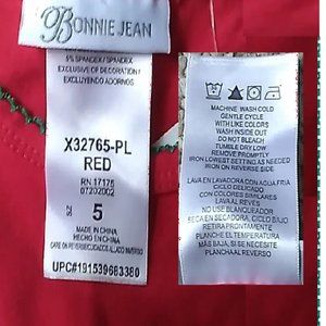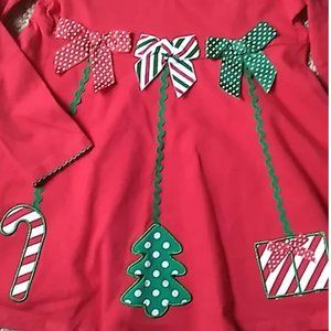 2-piece set, red long sleeved top with round neckline. Polka dot bows and candy came strips, green trim around neck and sleeves. All over polka dot print leggings Square encased elastic waistband, straight hem, full length and full on construction.