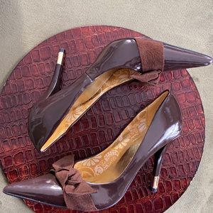 Faux brown suede bow. Pointed toe. Gold accent on the heel stem.