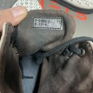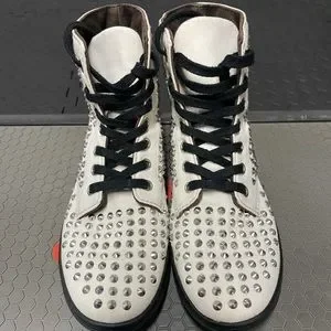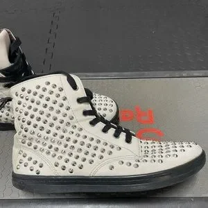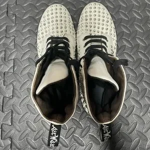 These badass shoes are studded with small spikes throughout. They are in good condition, however, they have slight orange staining in a few areas and a bit of fraying around one of the spikes near the toe (see photos), but all this is barely noticeable. The inside is a bit faded as well, but who sees that?! These were only worn a few times, so there isn’t much wear in the soles. Get them now and stick out from the crowd!