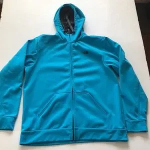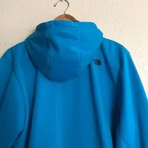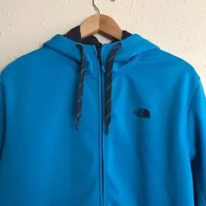 The North Face Hoodie (men’s), shell; 100% polyester, lining;100% polyester, color blue, great condition like new