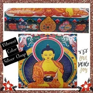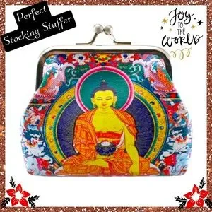 The Holidays are upon us!! It's time to load up on Stocking Stuffers and last minute gifts! Give someone the gift of Good Luck with this adorable little Buddha Coin Purse. This Petite Coin Purse is gorgeous in Vibrant Colors of Reds, Oranges, Blues, Yellow, Green and White. The Beautiful Vintage Print of Buddha is pictured on both front & back and the closure is a Silver Toned Clasp. The interior is Solid Ecru.
