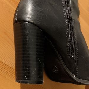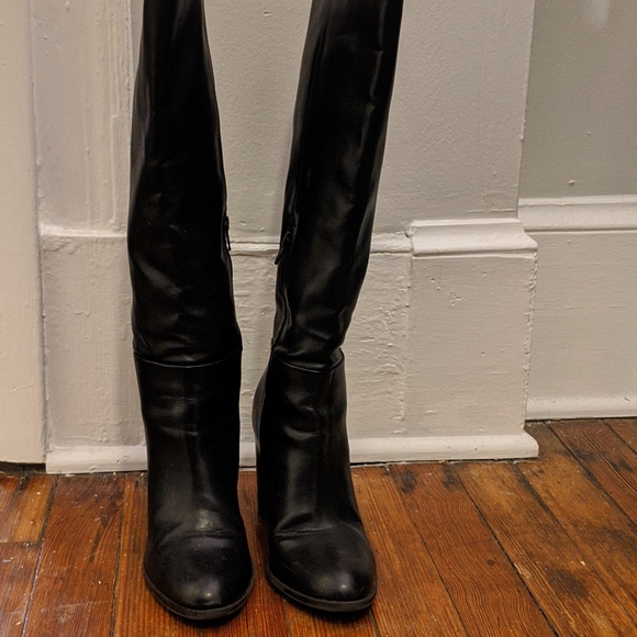 Tall black boots with 3.25" heels. Worn 3-4 times and in great condition. Comfortable with a sleek heel that will go great with tights for holiday parties! Some slight wear on back of left heel (last picture).