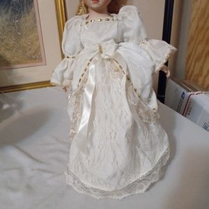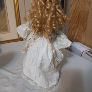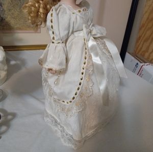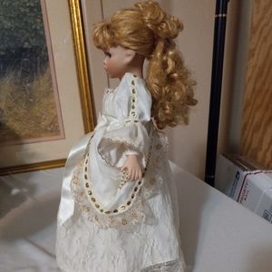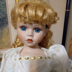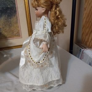 Vtg Porcelain Doll Blonde Hair Blue Eyes in Silky Dress