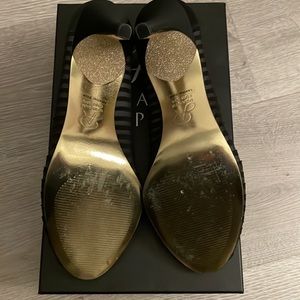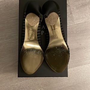 And black tuxedo striped fabric throughout shoe worn only wants to an event. Size 9 1/2 M absolutely beautiful. Please refer to photos for greater details. Housed in the smoke and pet free environment. All reasonable offers considered.